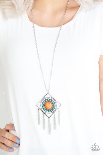 Radiating with refreshing orange and turquoise stones, a round frame is nestled inside of an airy silver square for a tribal inspired look. Attached to a lengthened silver chain, the colorful stone pendant gives way to rows of silver chain fringe for a statement-making finish. Features an adjustable clasp closure.